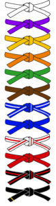 Blue stripe belt is next this is one of the few striped belts that are in family class. Next is the full colour blue belt. Following Blue is the red stripe belt, once students have earnt this belt all future gradings will be panel gradings taking place outside of their typical class and for a longer duration. Once students have passed their first panel grading they will earn their full colour red belt. The next belt after red is the deputy black belt (black with a red stripe) Once students have reached deputy black belt their are two options next depending on their age if the student is 11 years or younger their next belt will be their junior black belt then would be their first degree black belt after that.